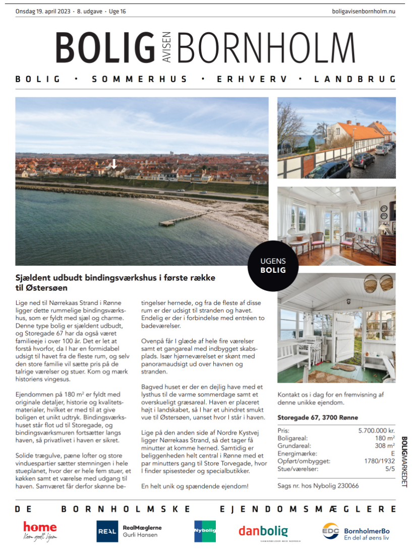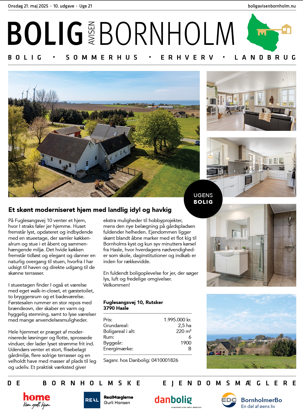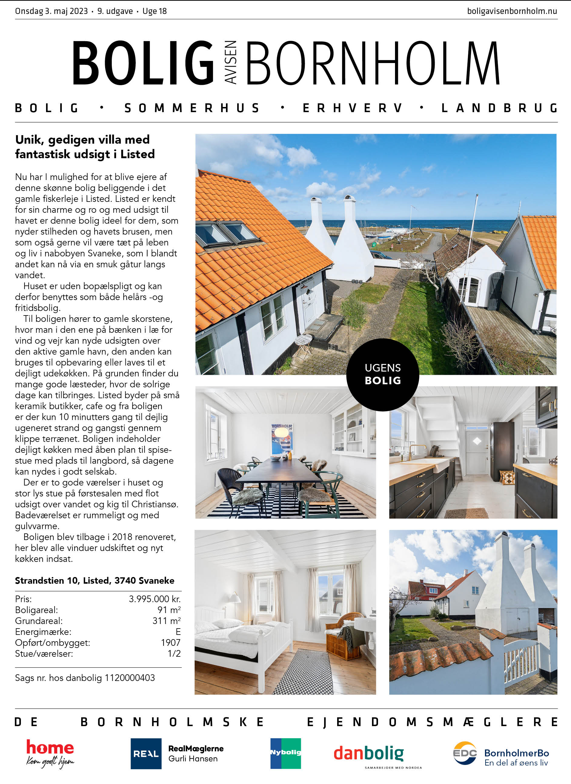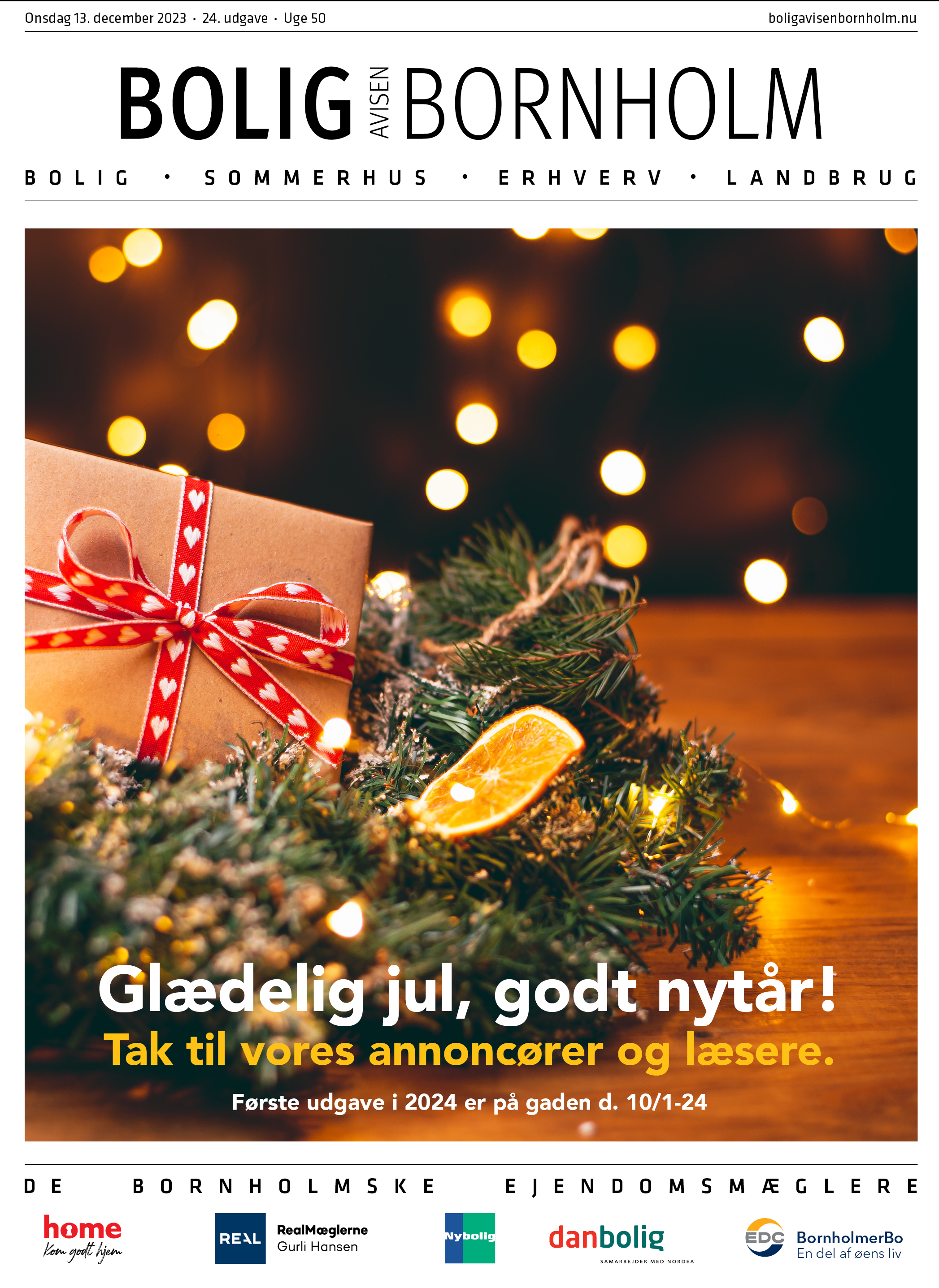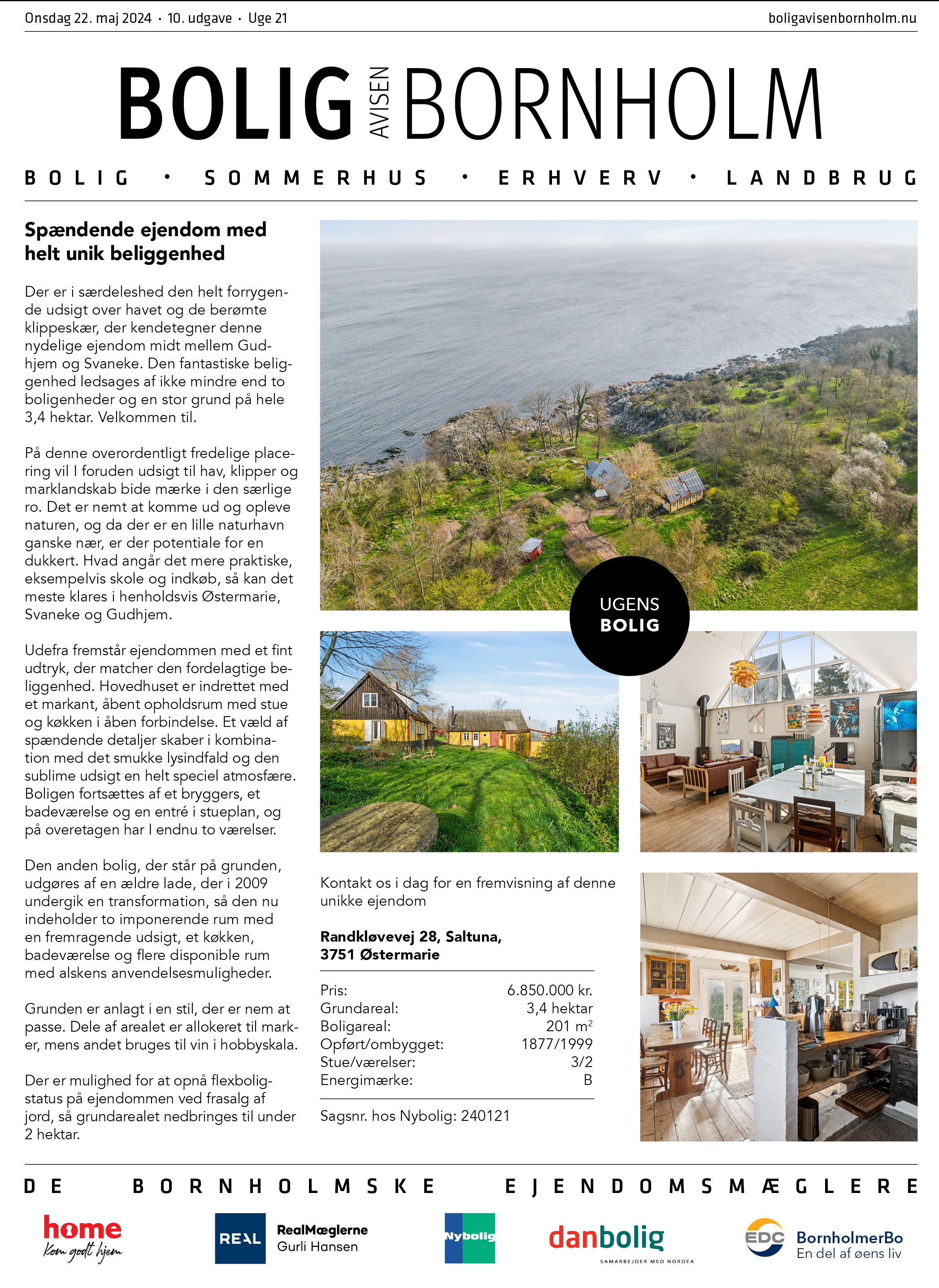 Boligavisen Bornholm er Bornholms førende avis med et stort udbud af boliger til salg indenfor Privat – Sommerhus – Erhverv og landbrug. Annoncørerne arbejder professionelt og målrettet med at formidle og forene sælger med køber. Boligavisen Bornholm udkommer hver anden uge på hele Bornholm.