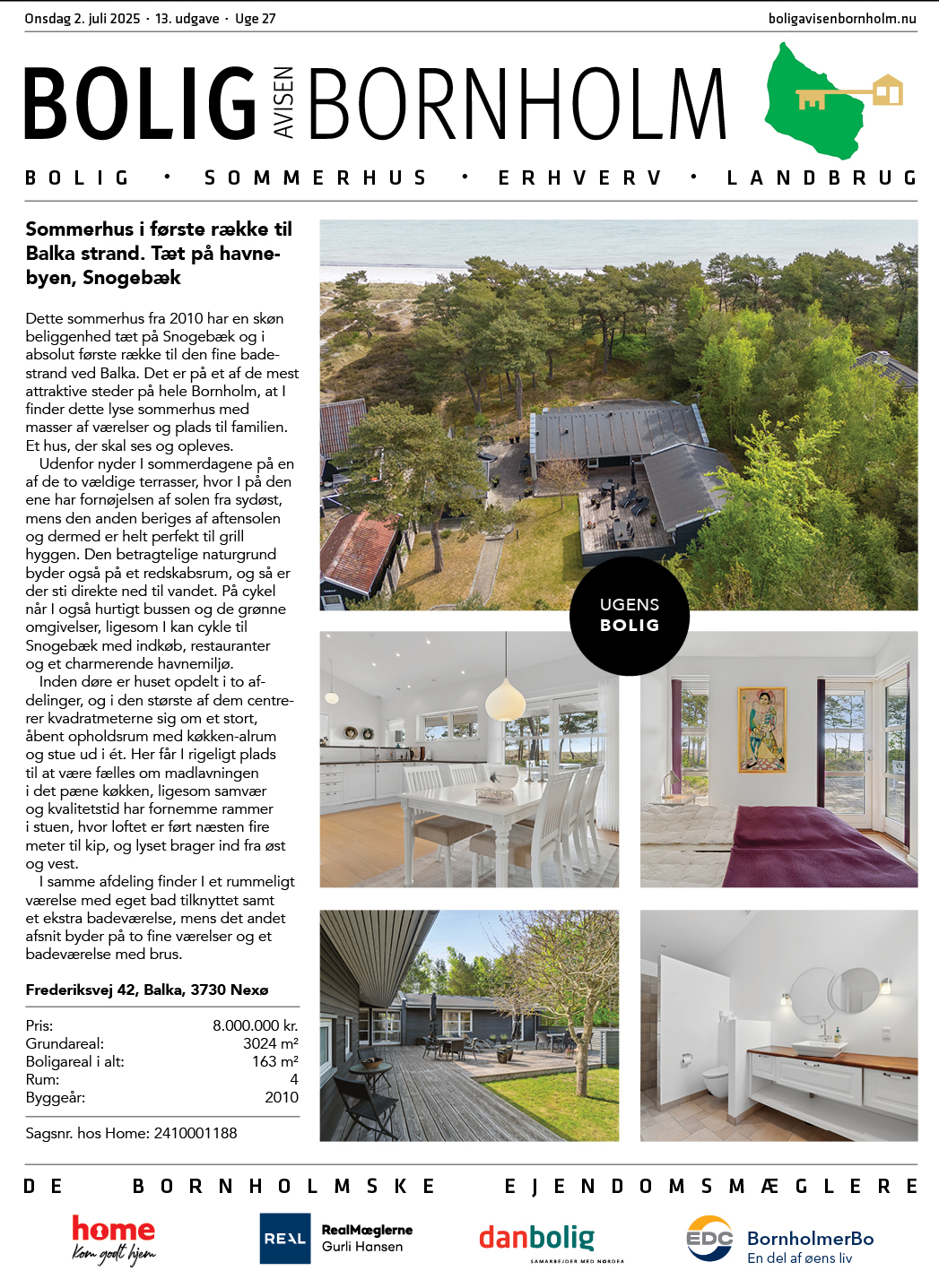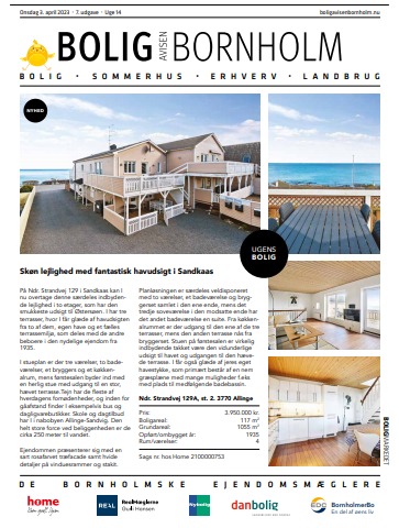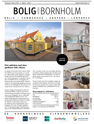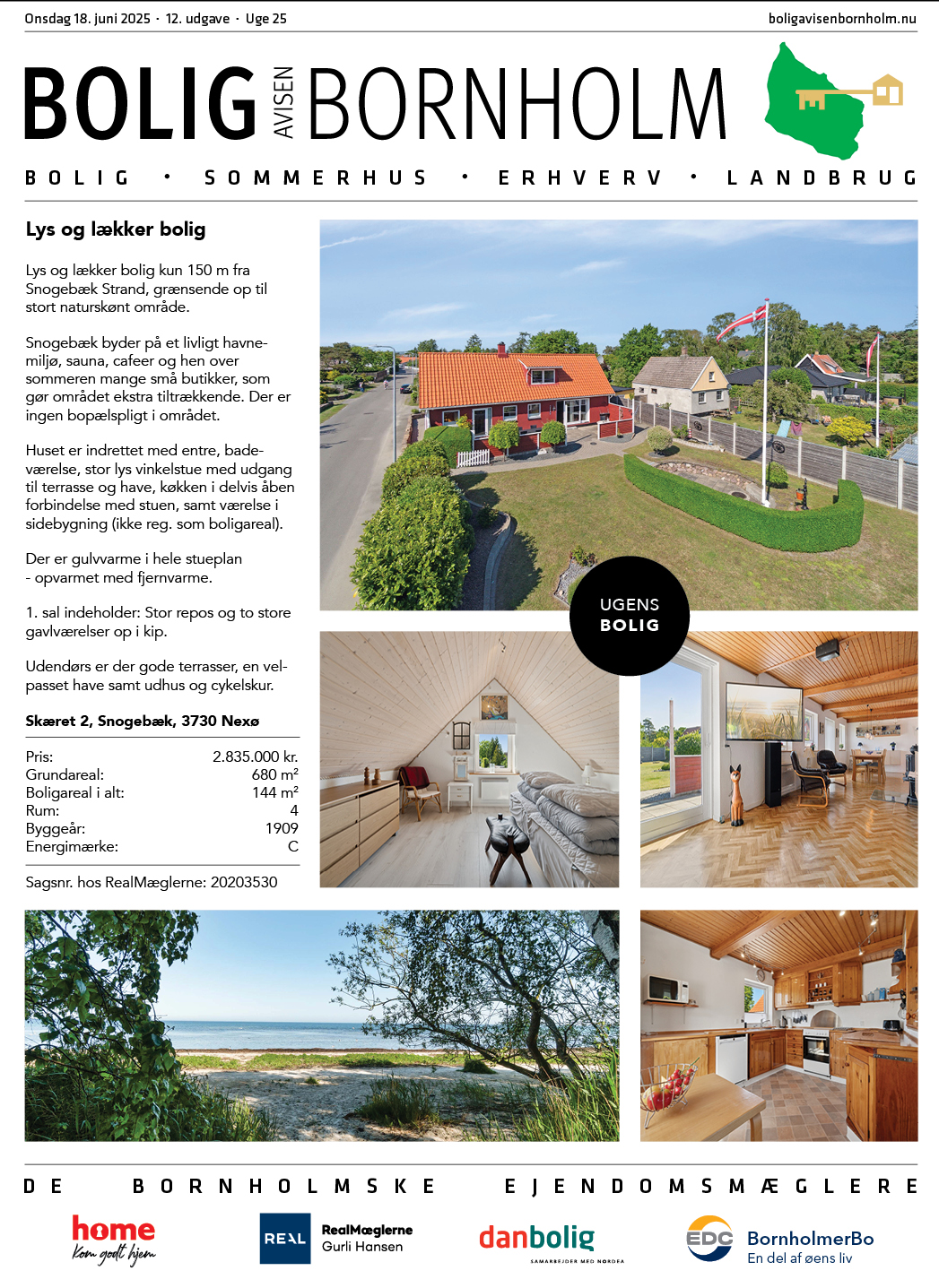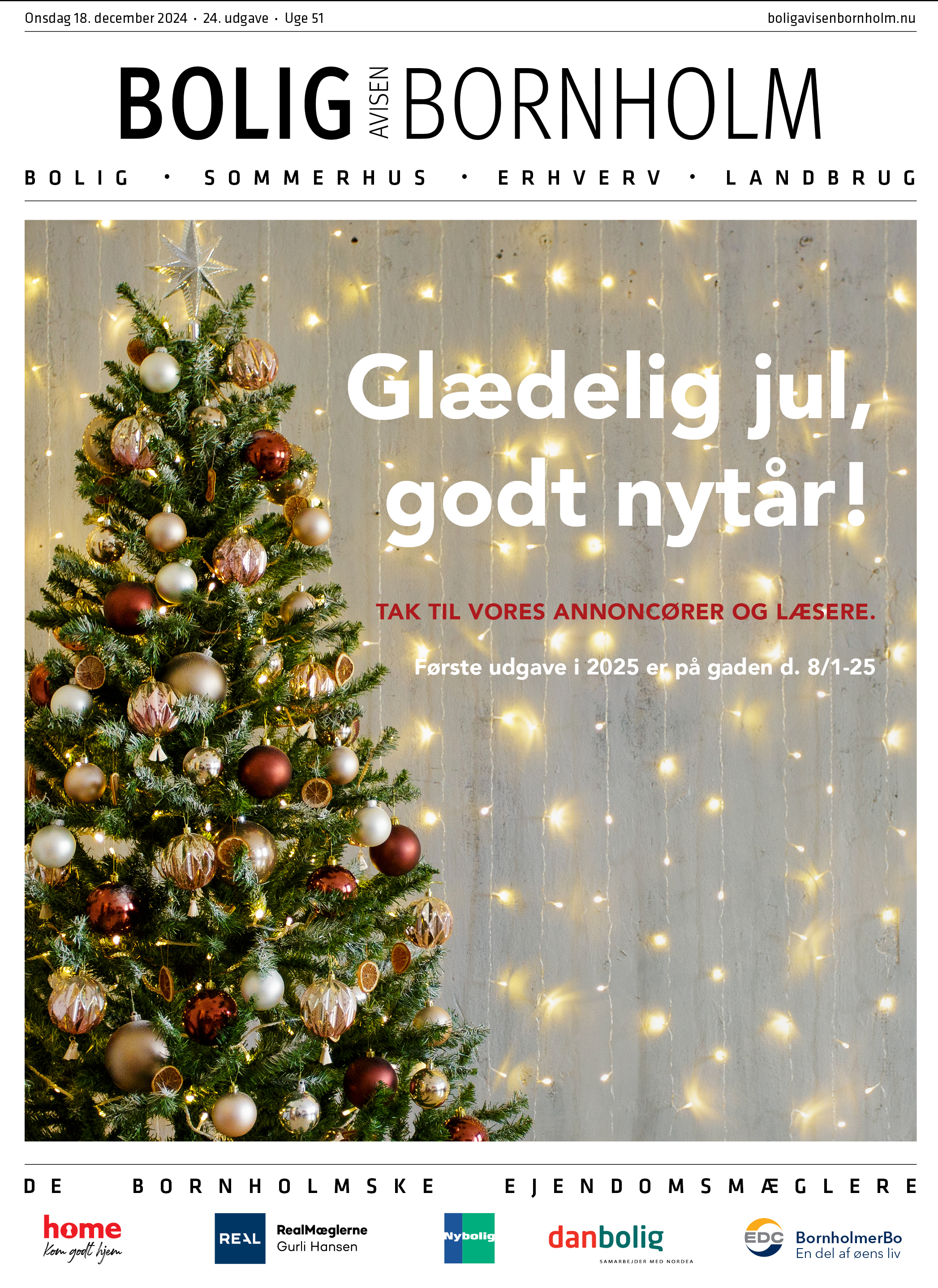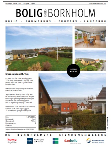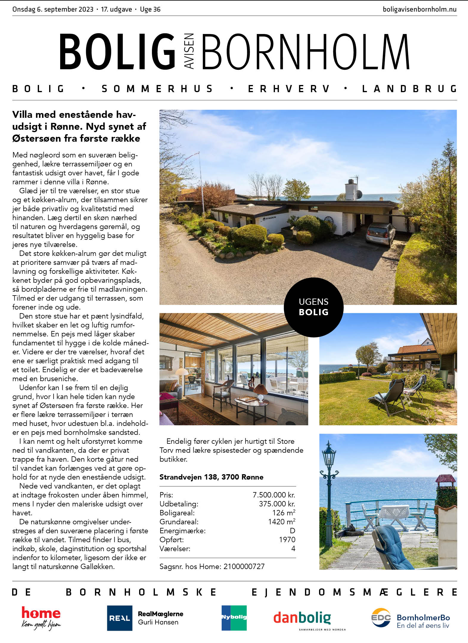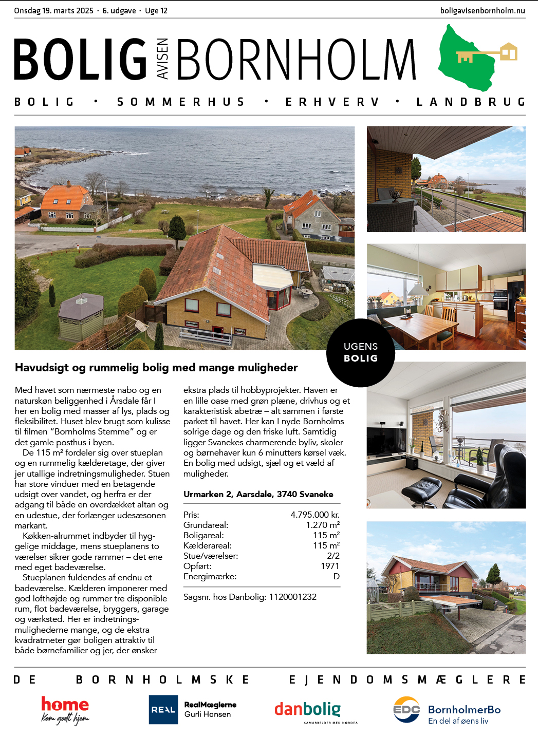 Boligavisen Bornholm er Bornholms førende avis med et stort udbud af boliger til salg indenfor Privat – Sommerhus – Erhverv og landbrug. Annoncørerne arbejder professionelt og målrettet med at formidle og forene sælger med køber. Boligavisen Bornholm udkommer hver anden uge på hele Bornholm.