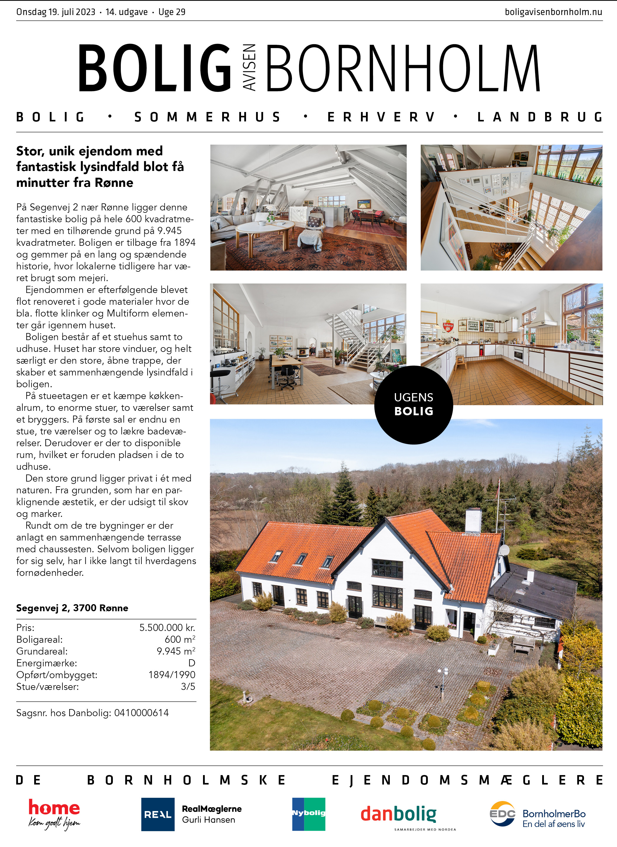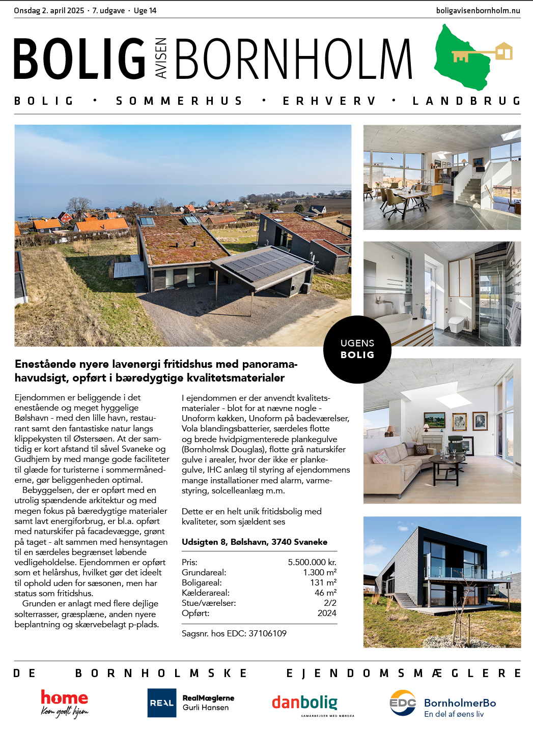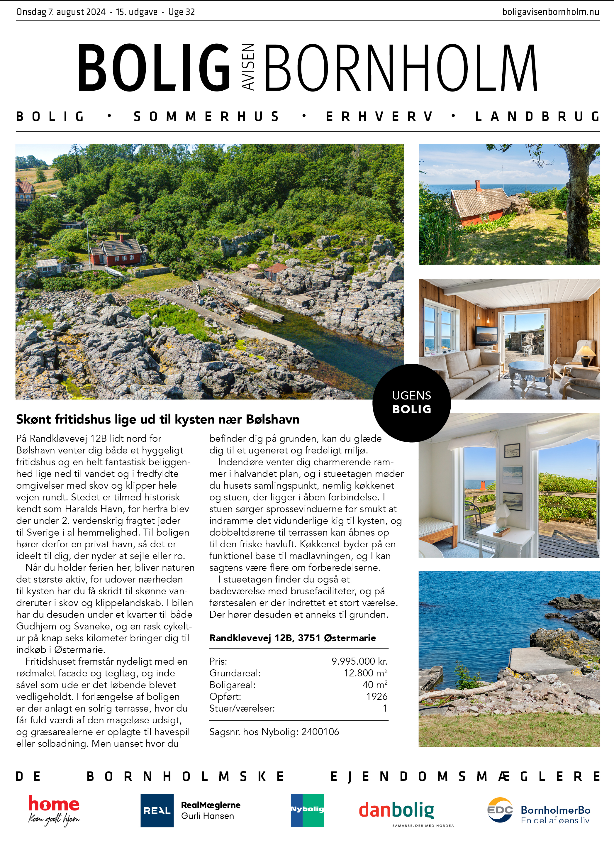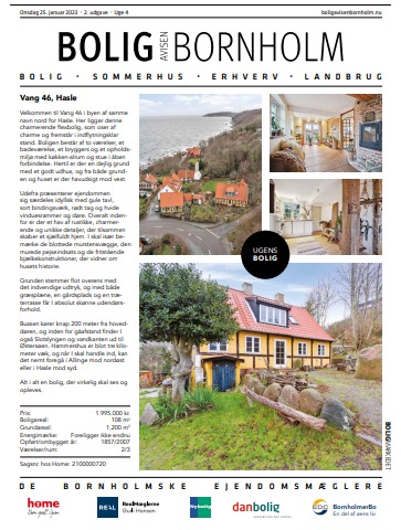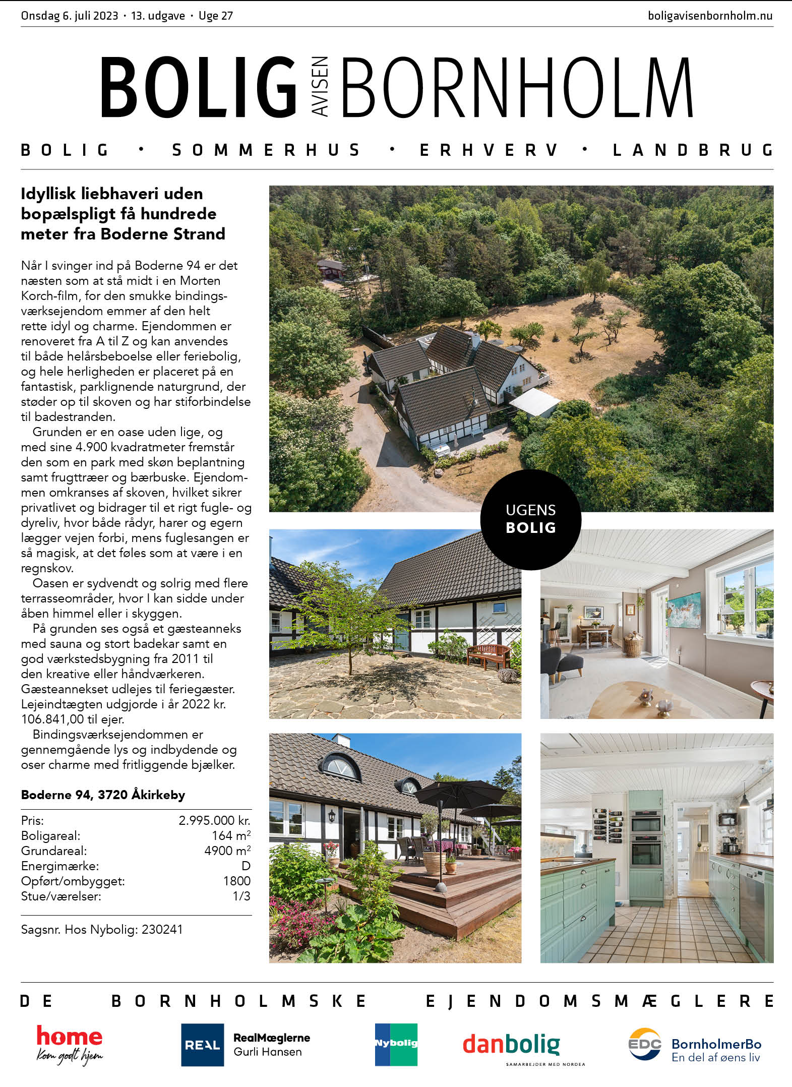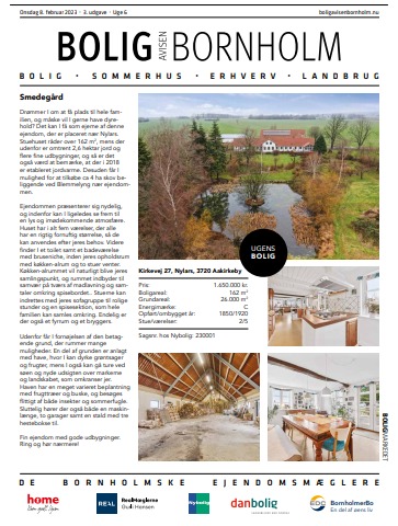 Boligavisen Bornholm er Bornholms førende avis med et stort udbud af boliger til salg indenfor Privat – Sommerhus – Erhverv og landbrug. Annoncørerne arbejder professionelt og målrettet med at formidle og forene sælger med køber. Boligavisen Bornholm udkommer hver anden uge på hele Bornholm.