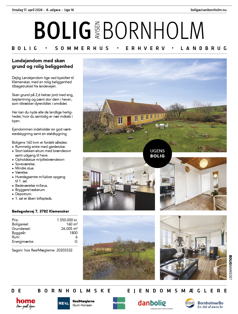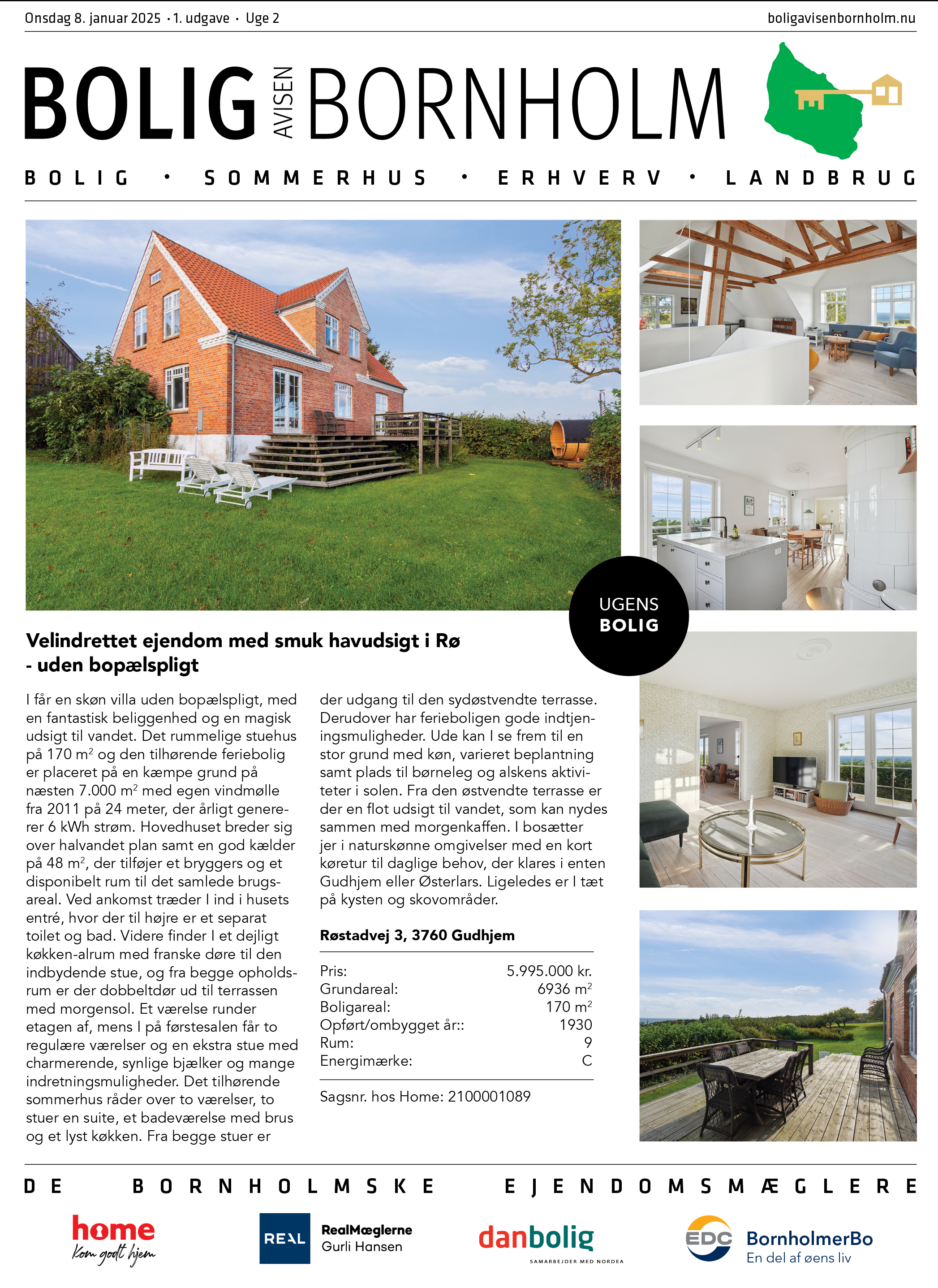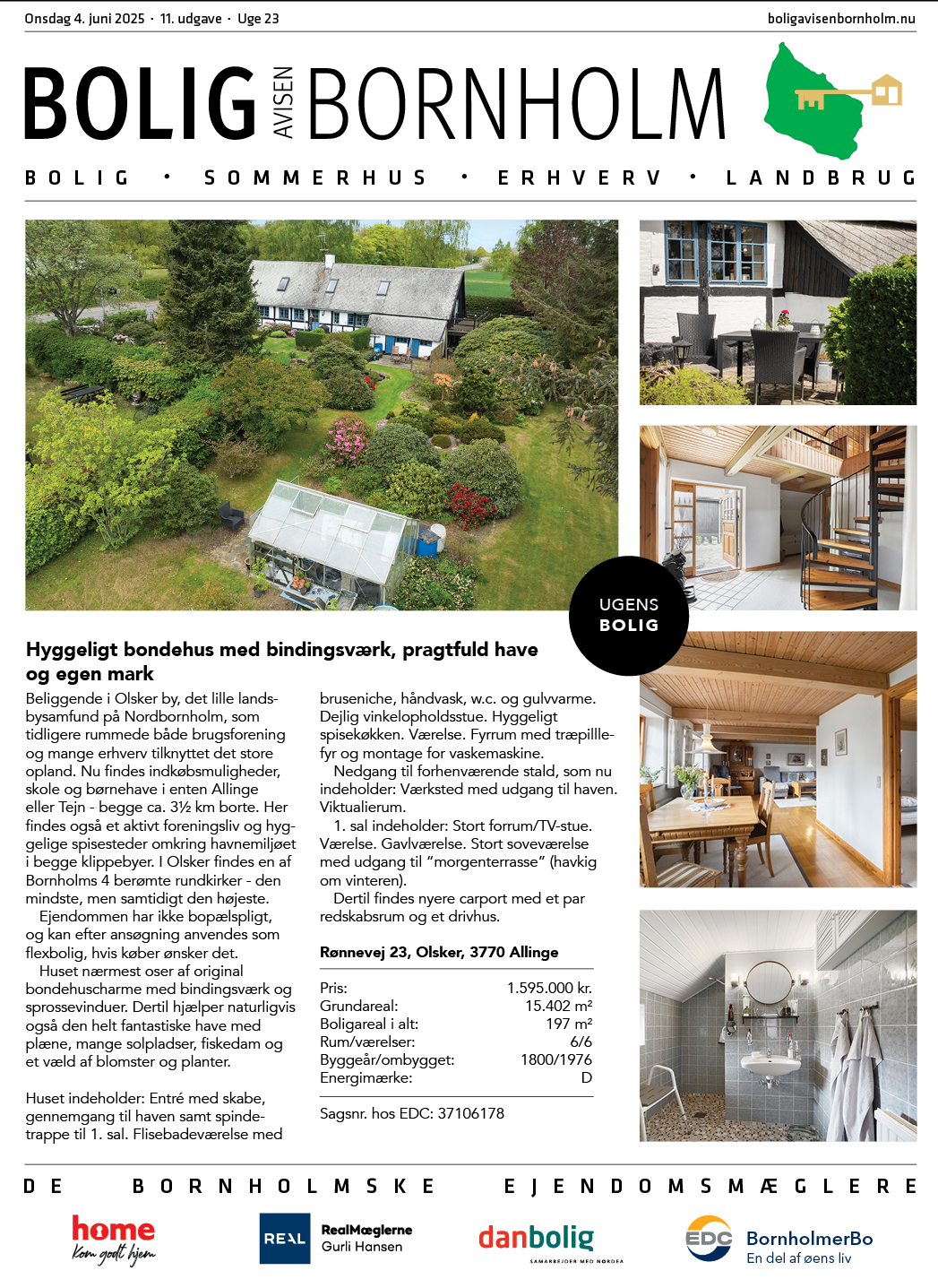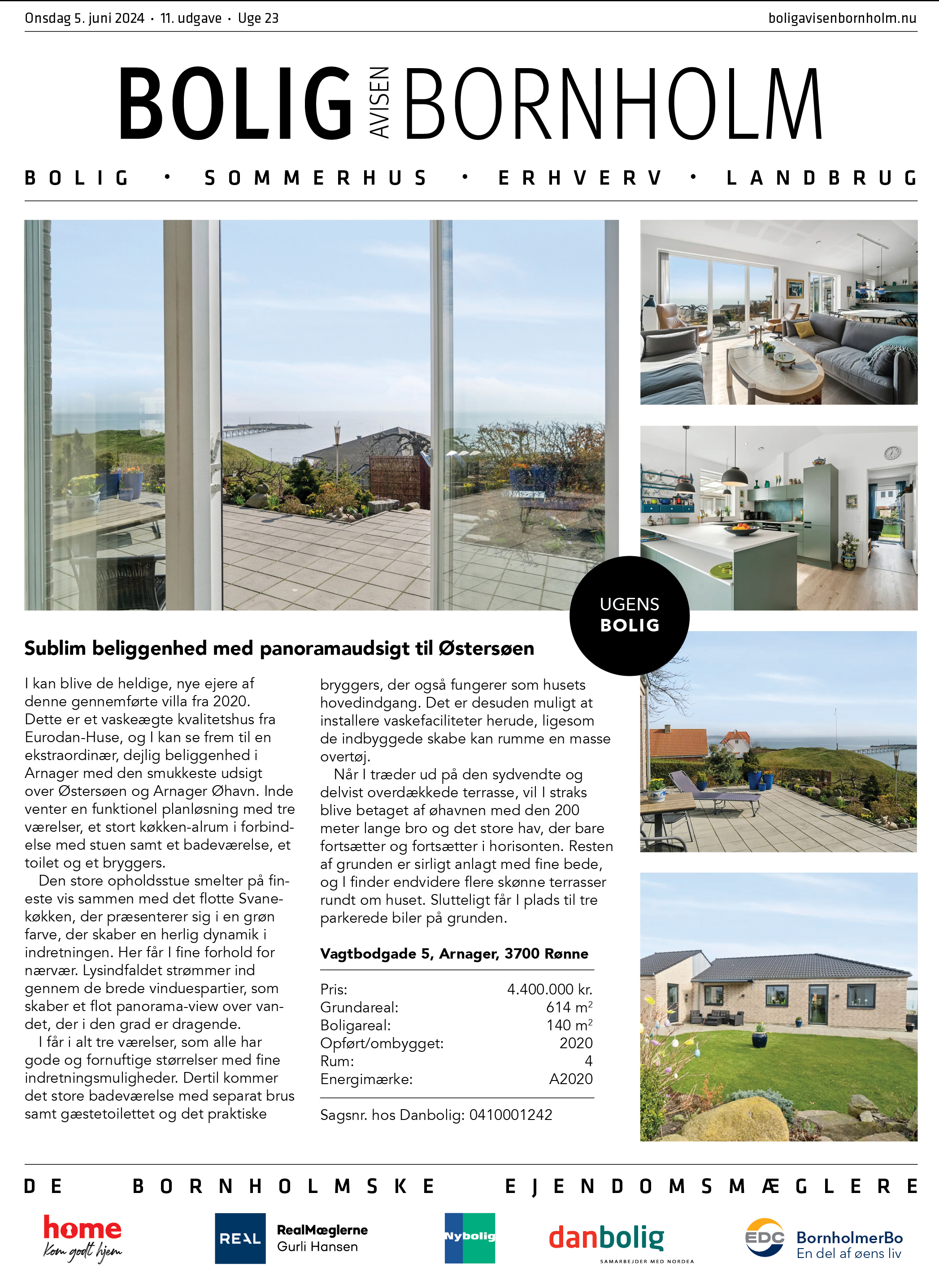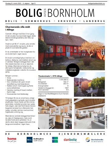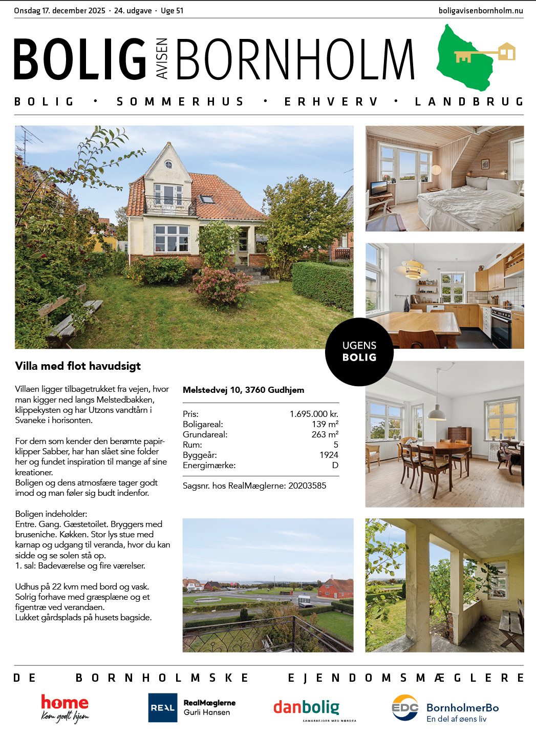 Boligavisen Bornholm er Bornholms førende avis med et stort udbud af boliger til salg indenfor Privat – Sommerhus – Erhverv og landbrug. Annoncørerne arbejder professionelt og målrettet med at formidle og forene sælger med køber. Boligavisen Bornholm udkommer hver anden uge på hele Bornholm.
