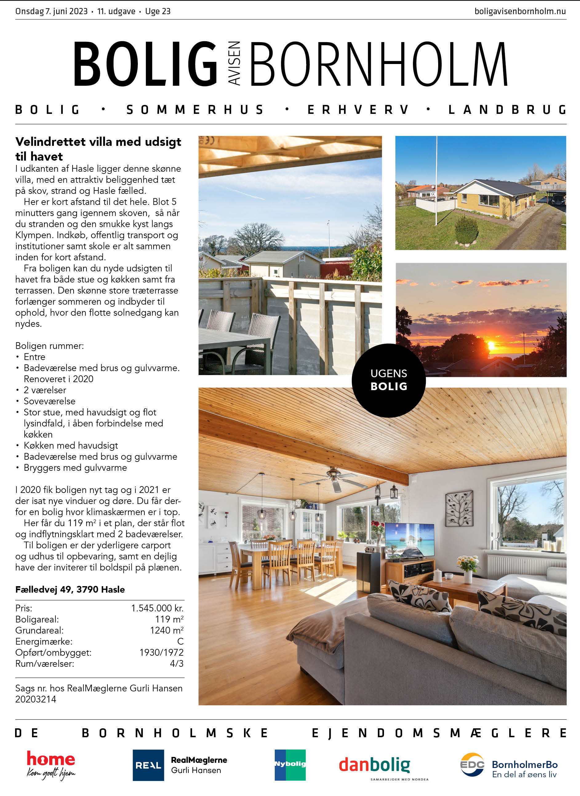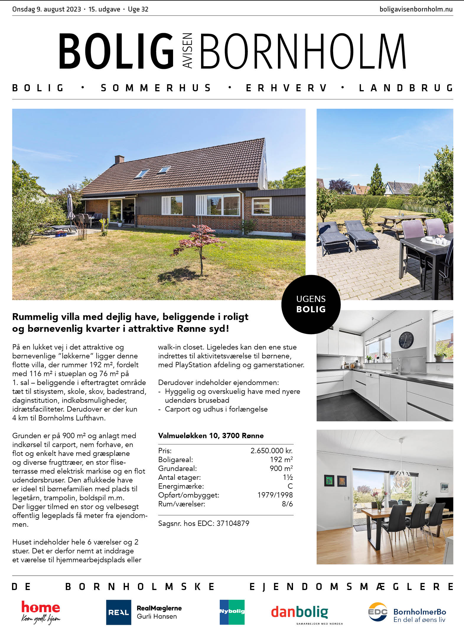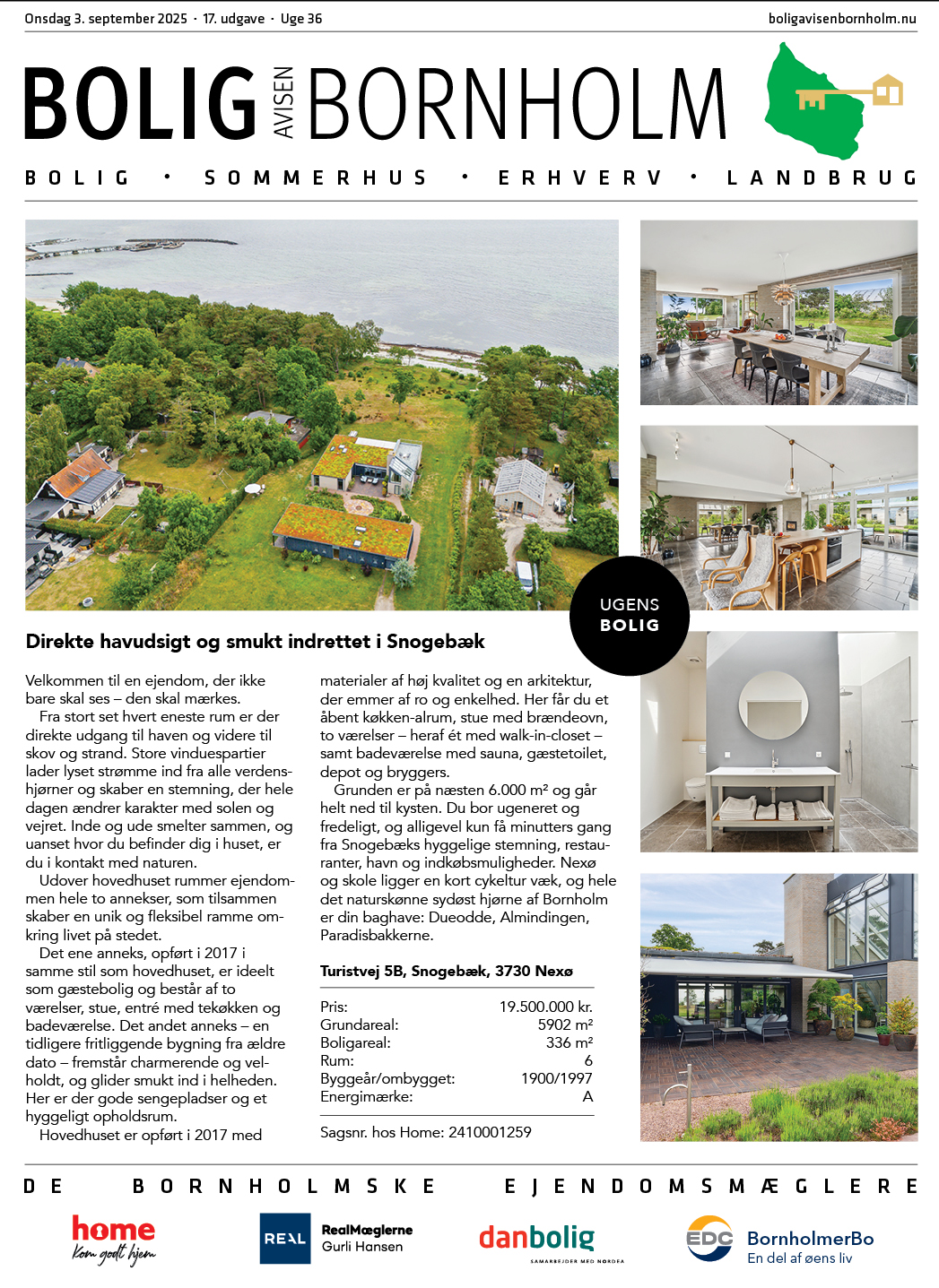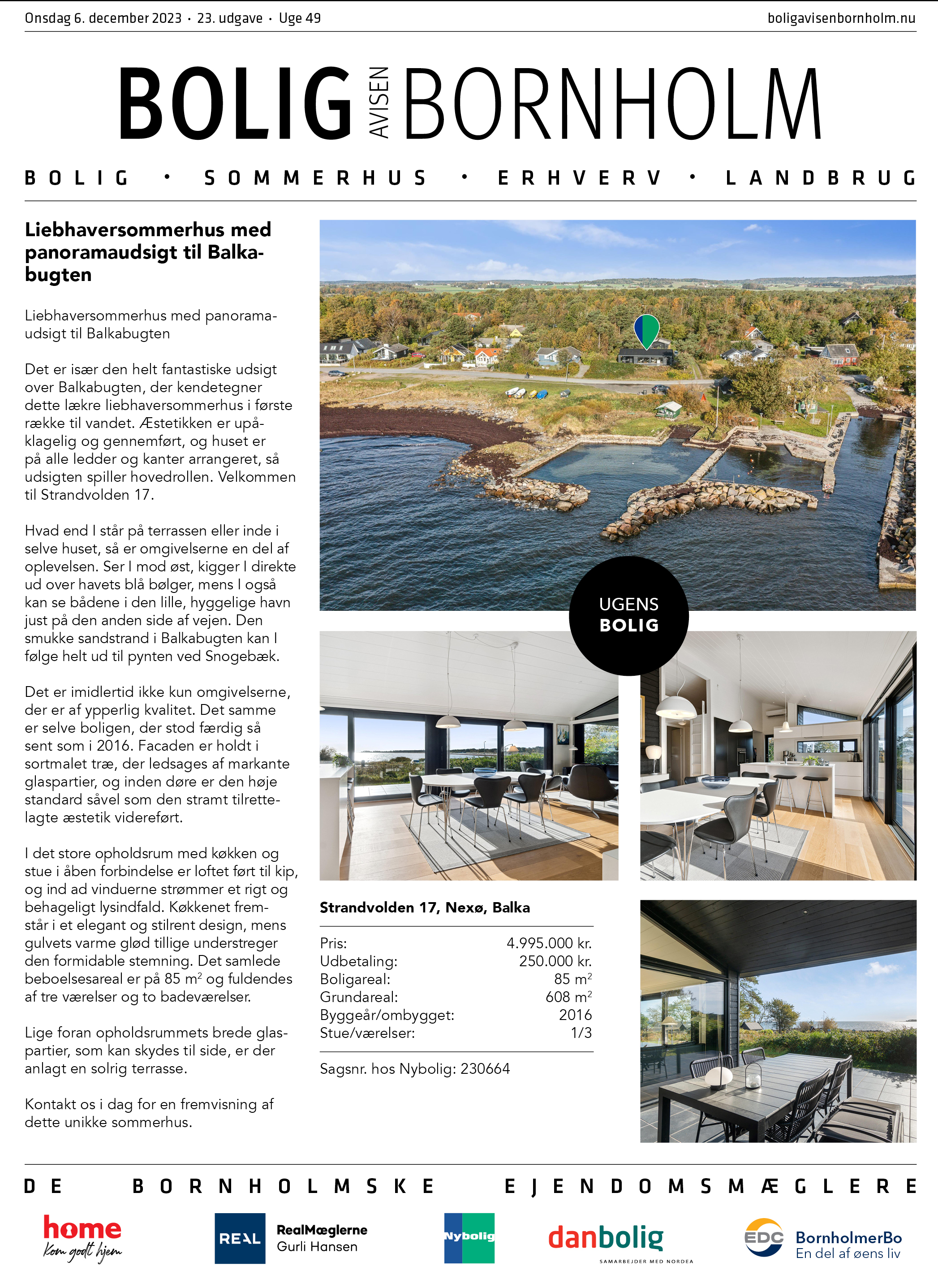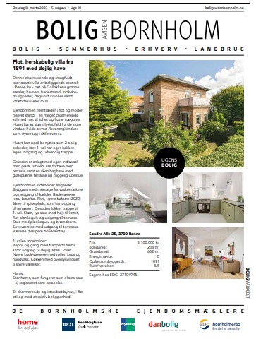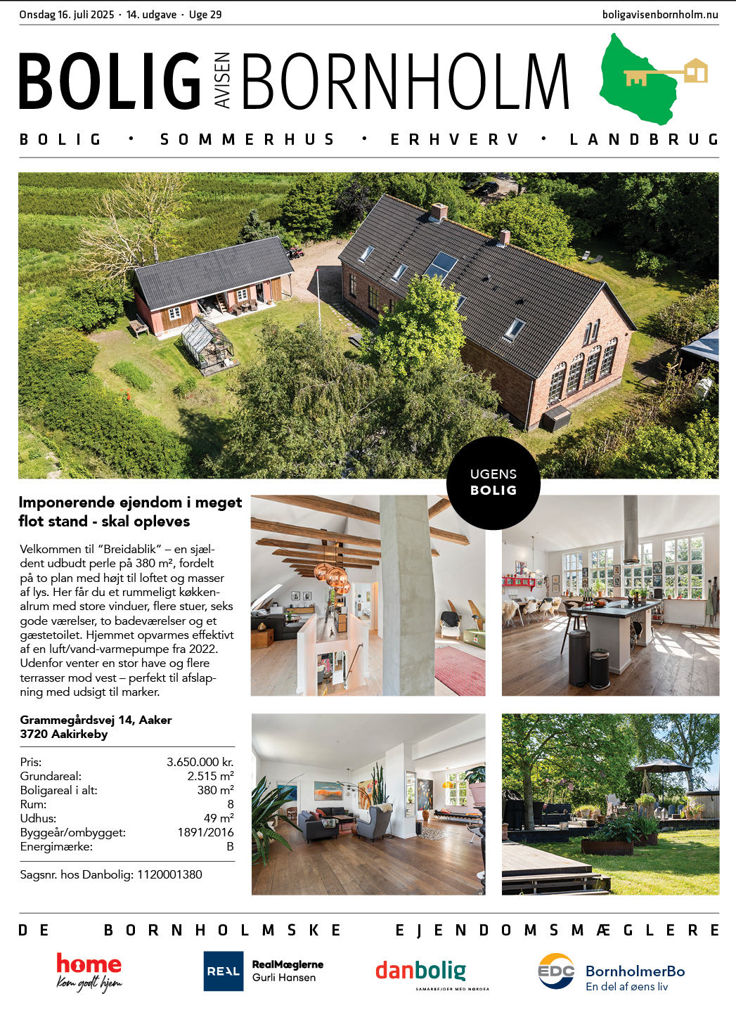 Boligavisen Bornholm er Bornholms førende avis med et stort udbud af boliger til salg indenfor Privat – Sommerhus – Erhverv og landbrug. Annoncørerne arbejder professionelt og målrettet med at formidle og forene sælger med køber. Boligavisen Bornholm udkommer hver anden uge på hele Bornholm.