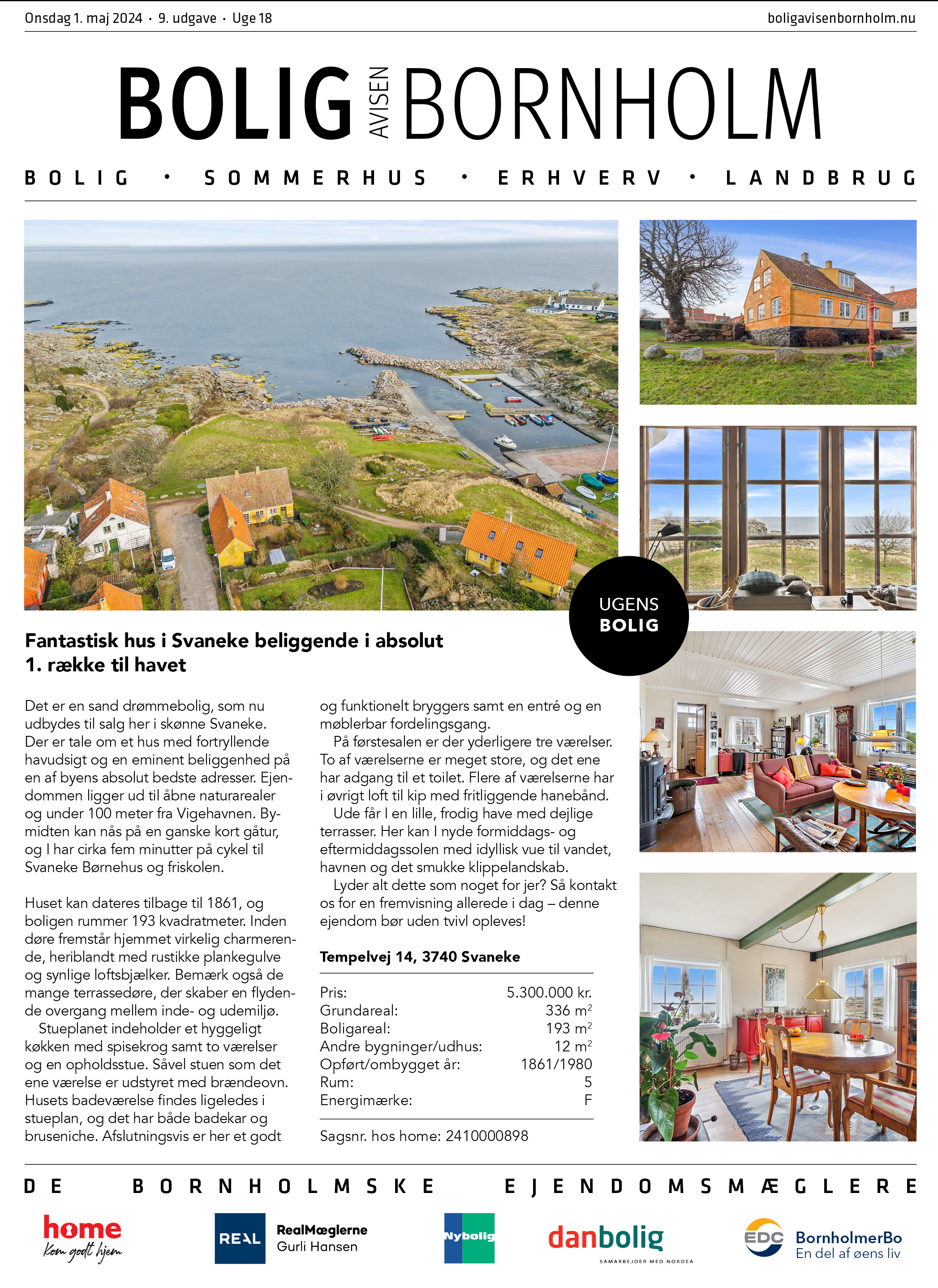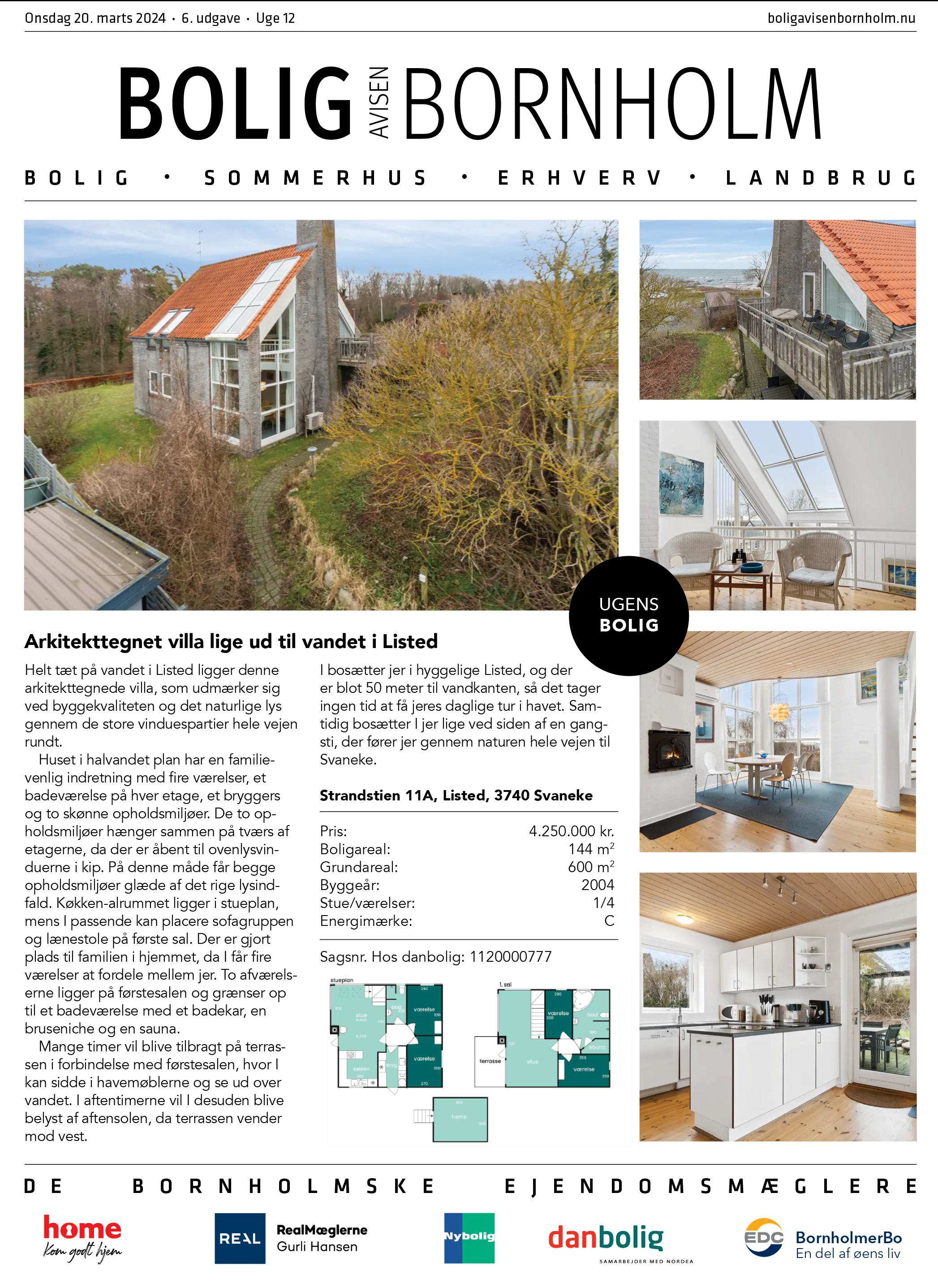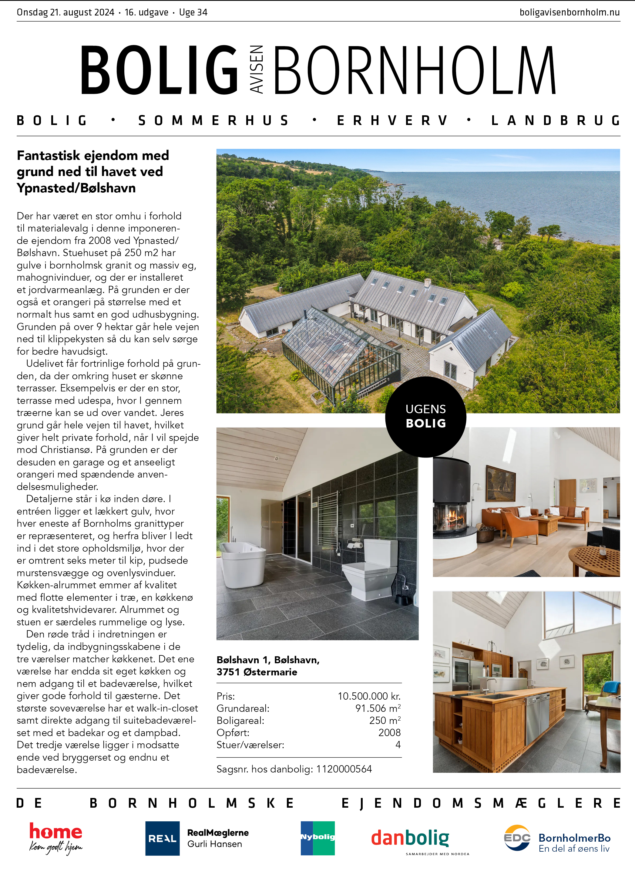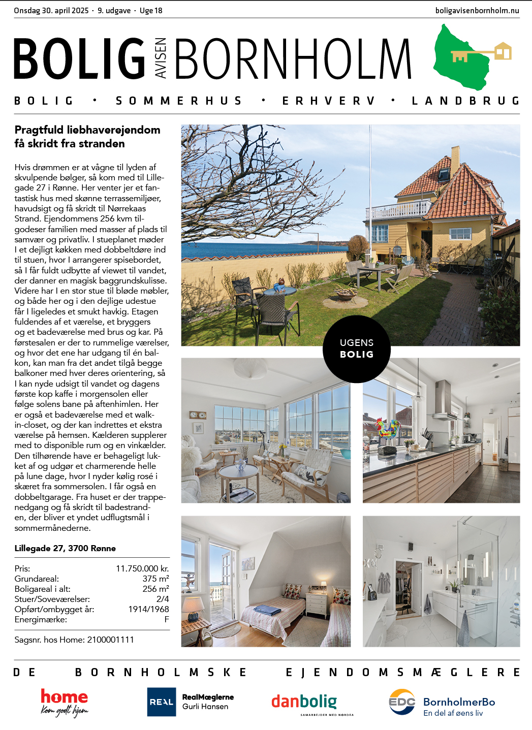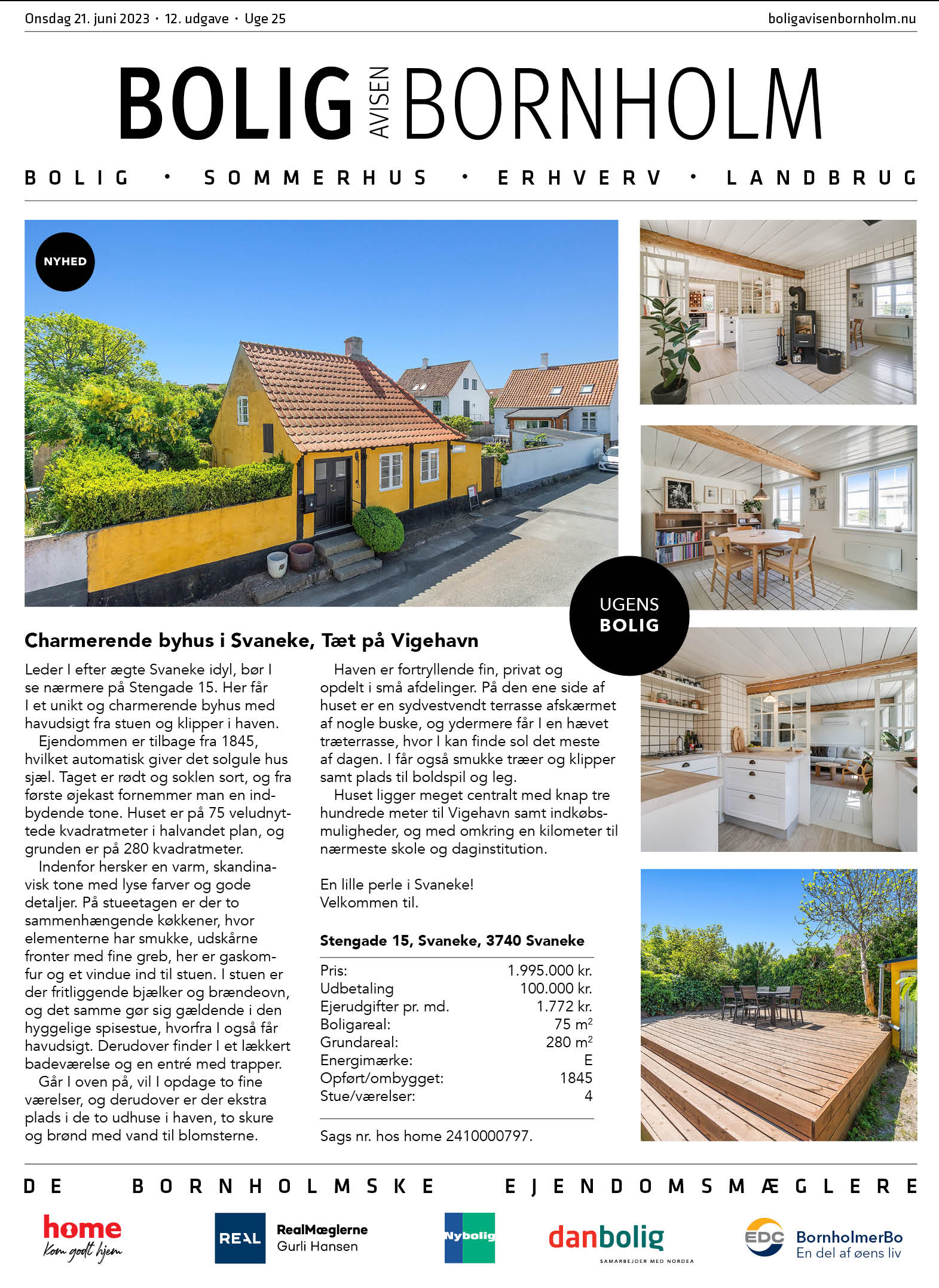 Boligavisen Bornholm er Bornholms førende avis med et stort udbud af boliger til salg indenfor Privat – Sommerhus – Erhverv og landbrug. Annoncørerne arbejder professionelt og målrettet med at formidle og forene sælger med køber. Boligavisen Bornholm udkommer hver anden uge på hele Bornholm.