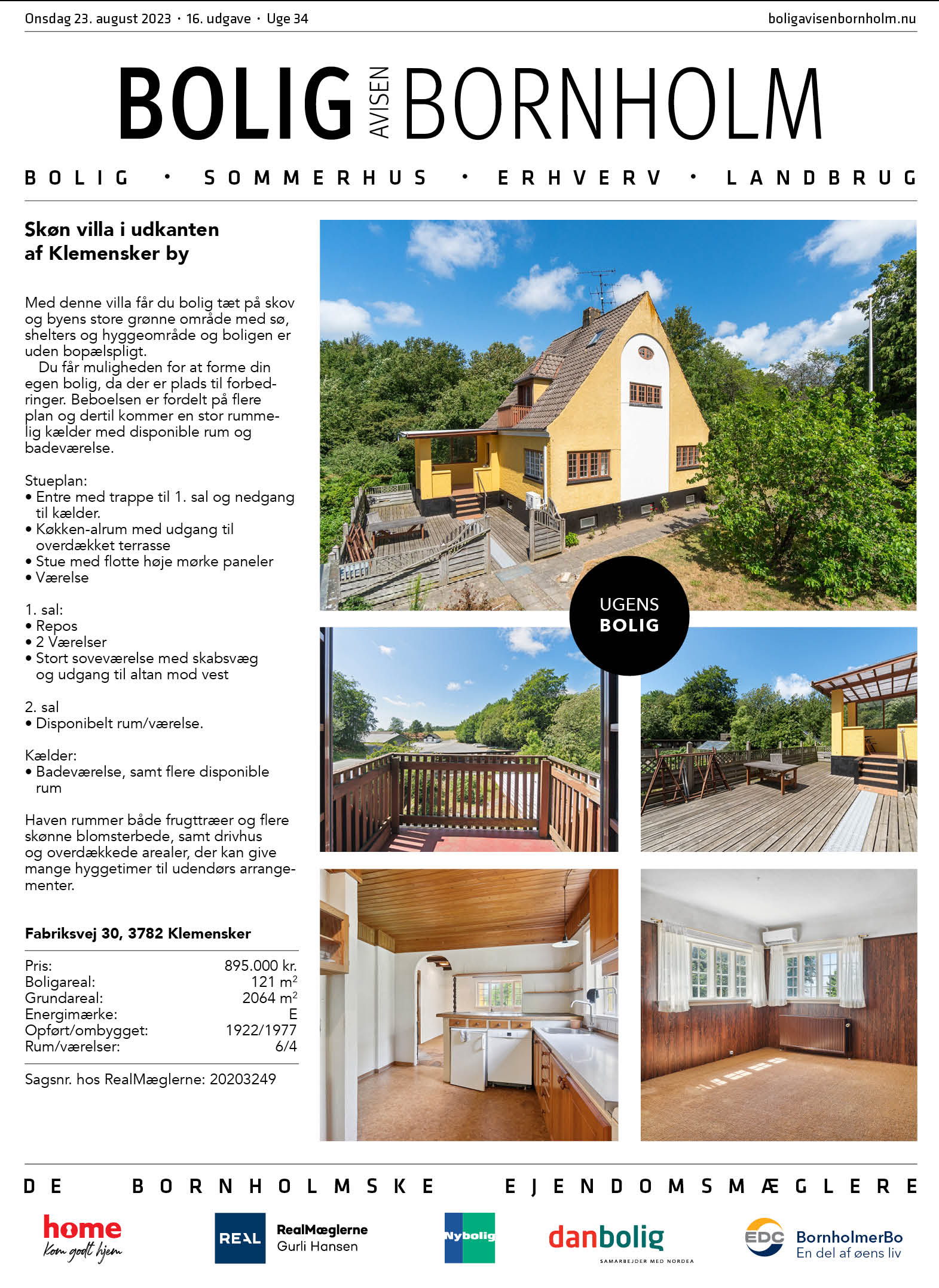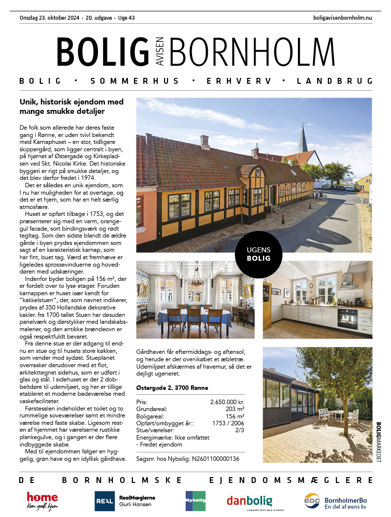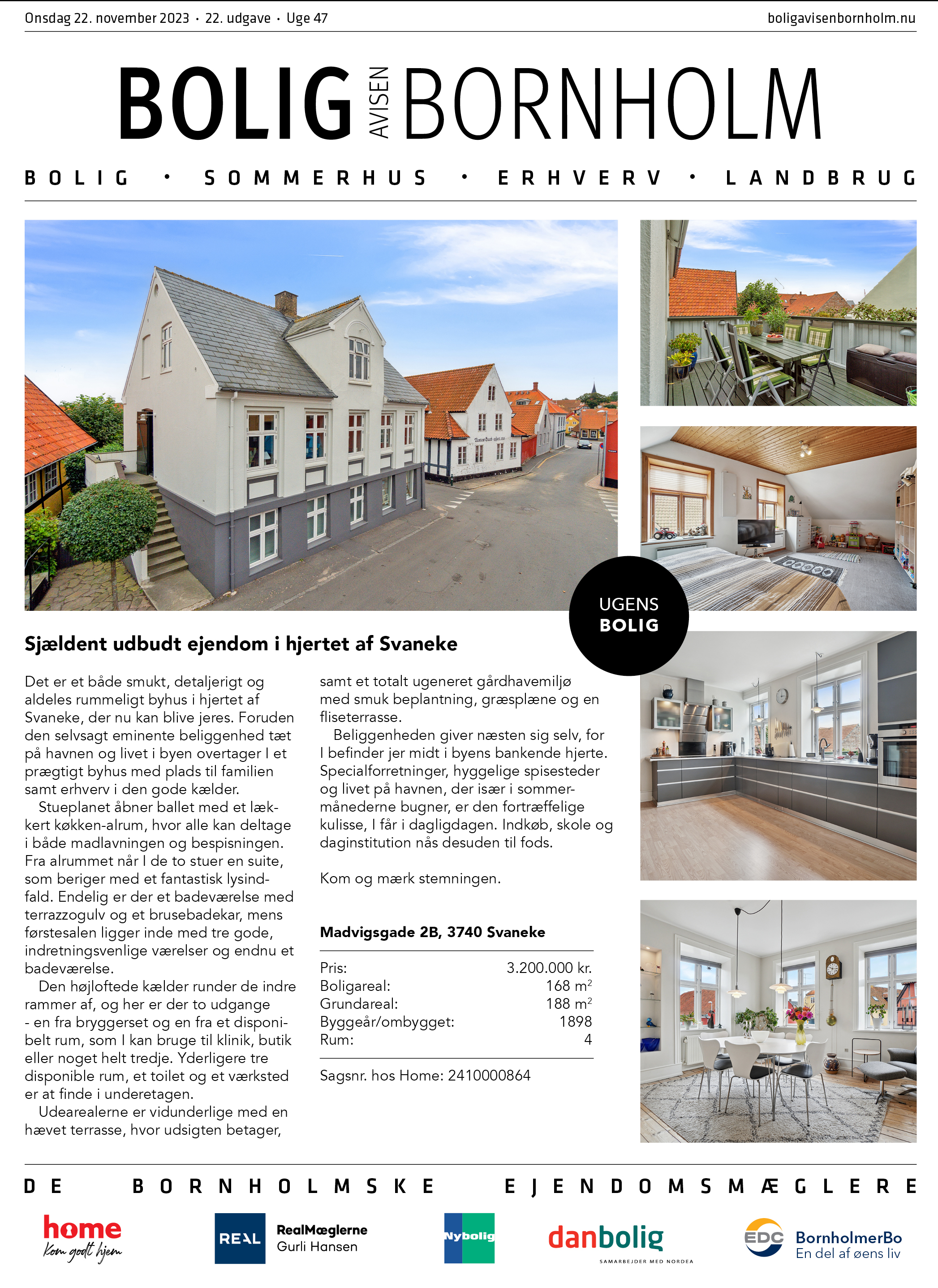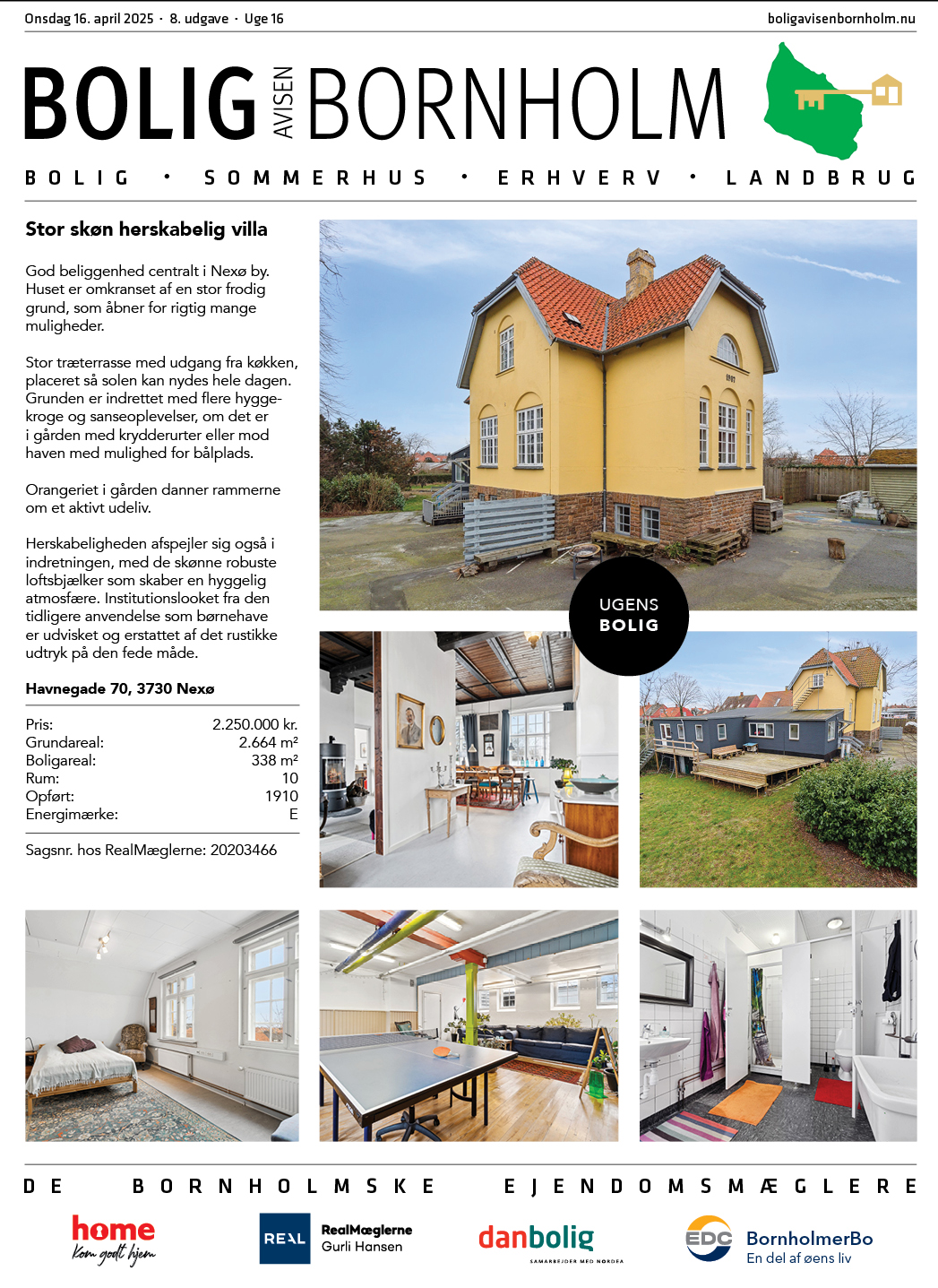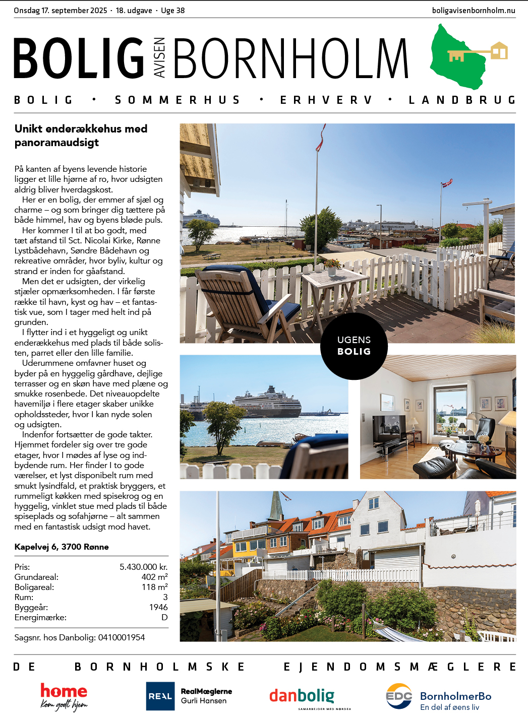 Boligavisen Bornholm er Bornholms førende avis med et stort udbud af boliger til salg indenfor Privat – Sommerhus – Erhverv og landbrug. Annoncørerne arbejder professionelt og målrettet med at formidle og forene sælger med køber. Boligavisen Bornholm udkommer hver anden uge på hele Bornholm.