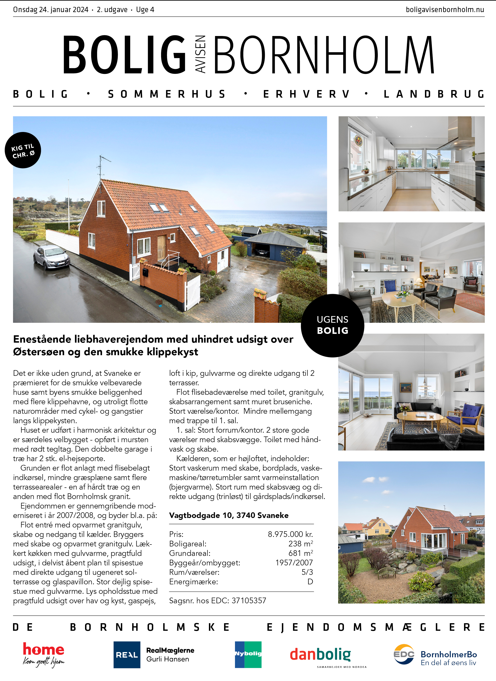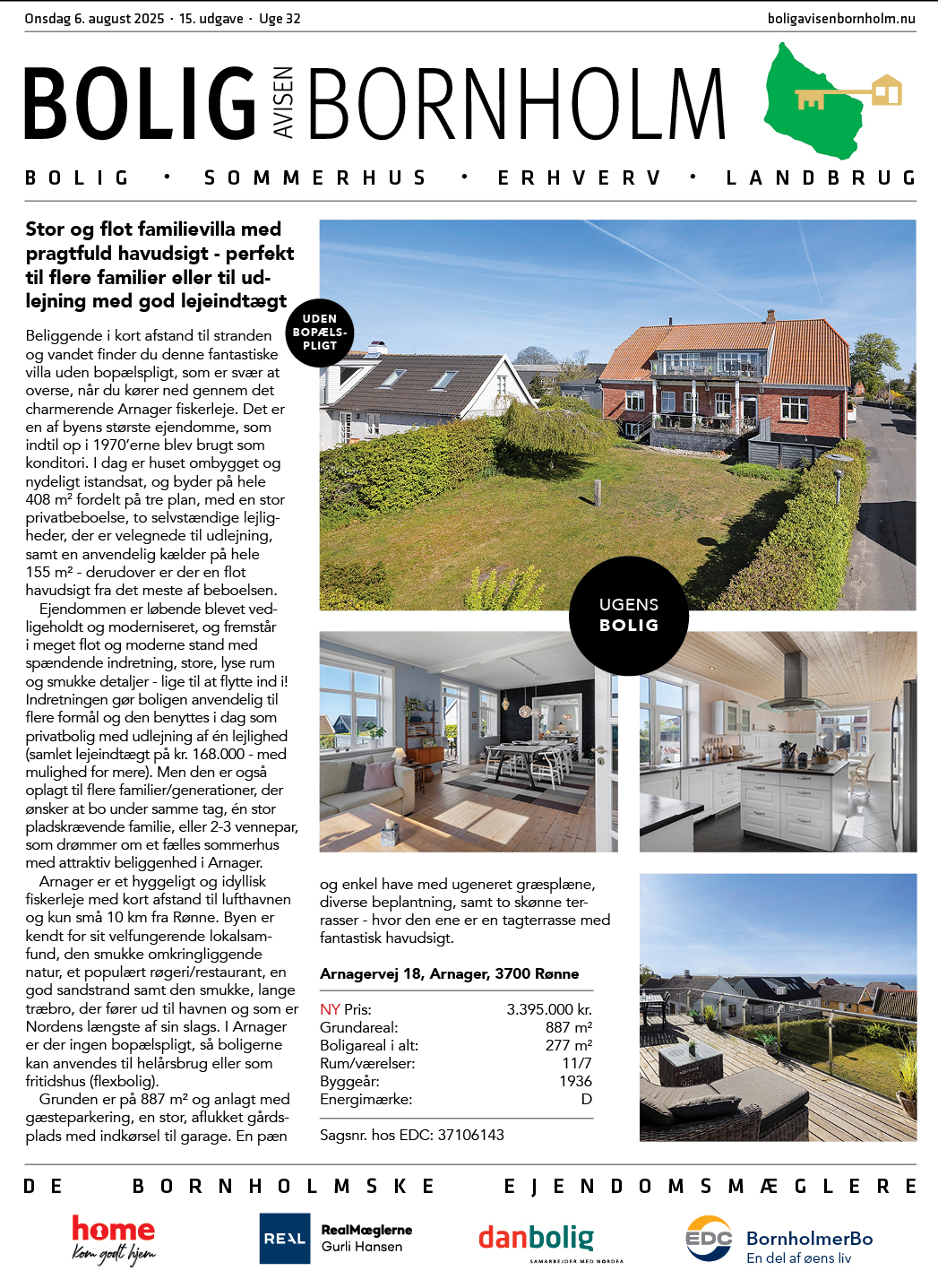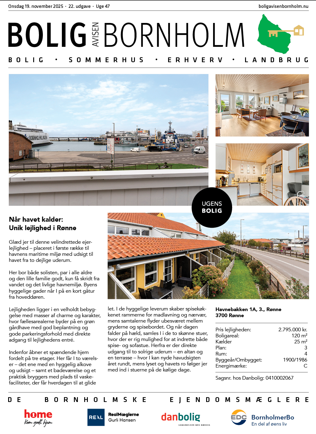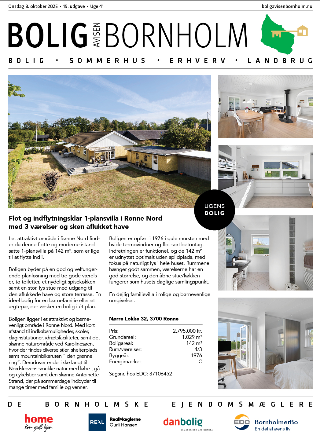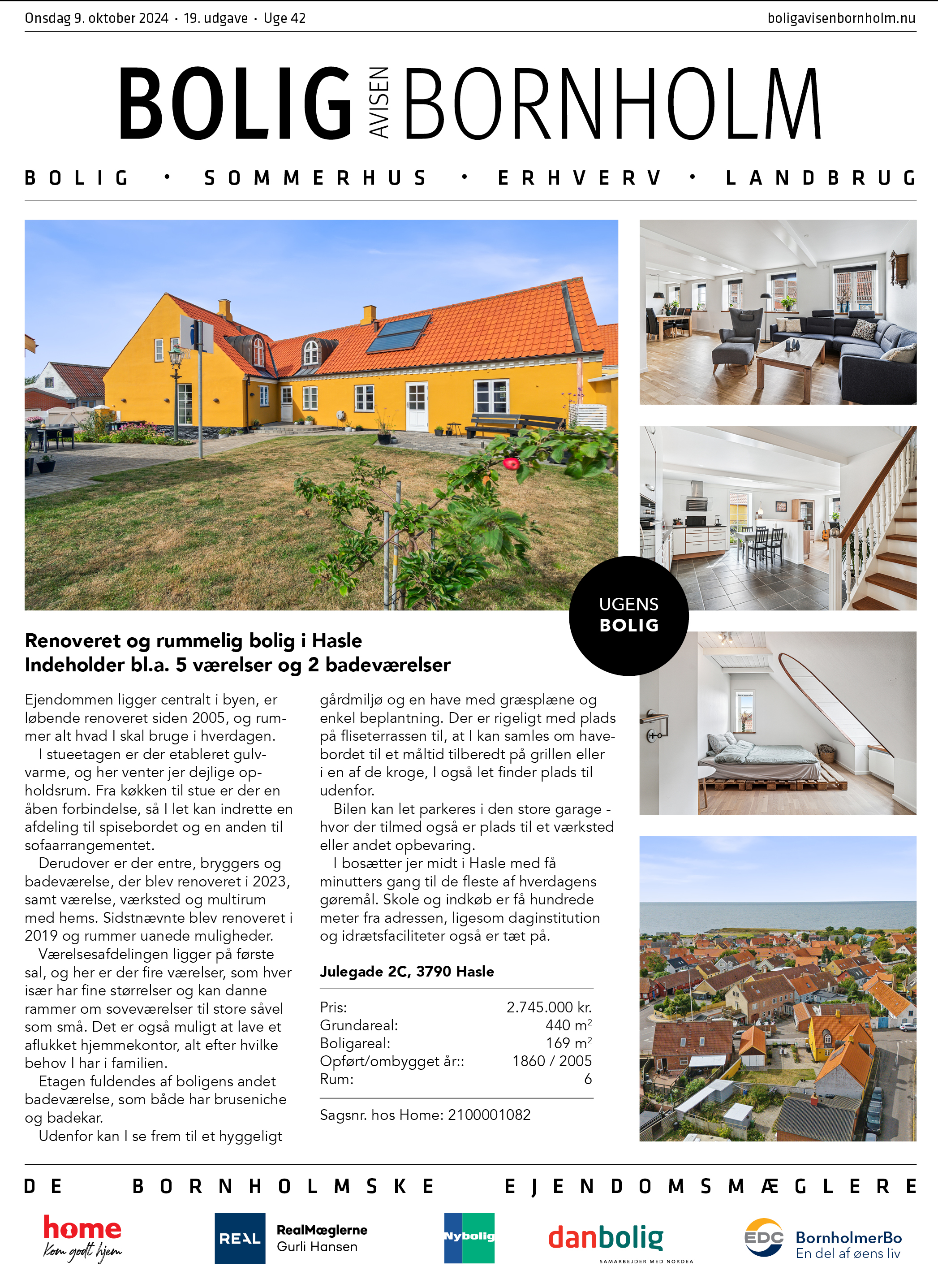 Boligavisen Bornholm er Bornholms førende avis med et stort udbud af boliger til salg indenfor Privat – Sommerhus – Erhverv og landbrug. Annoncørerne arbejder professionelt og målrettet med at formidle og forene sælger med køber. Boligavisen Bornholm udkommer hver anden uge på hele Bornholm.